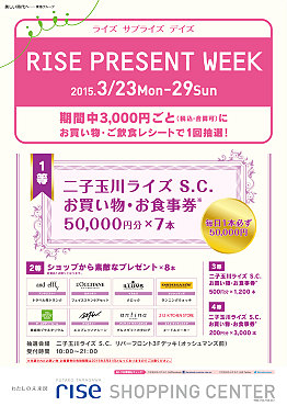 | 概要 | 二子玉川ライズS.C.では、日頃のご愛顧に感謝し、全館のお買いものされたお客様を対象として、プレゼント抽選会を実施します。 |