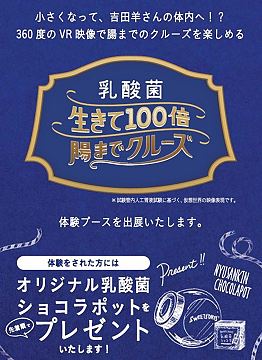 ![]() 小さくなって、吉田羊さんの体中へ!? 360度のVR映像で乳酸菌になりきって、腸までのクルーズを楽しめます! いま話題のVR映像と、映画館でも採用されているMX4Dシートを使用した体験イベント、「乳酸菌生きて100倍腸までクルーズ」(試験管内人工胃液試験に基づく、仮想世界の映像表現です。)を実施します!会場で配られるスタンプラリーをすべて集めるとオリジナルグッズもプレゼント。是非ご参加ください。 |