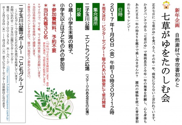 ![]() 正月七日に「七草がゆ」を食べると、その年一年、病気にならないと言われています。かまどベンチで作る「七草がゆ」で無病息災と新しい一年の無事を祈願し、心も身体もあたたまる一年の始まりを親子で楽しみませんか?園内の植物を使って青空書初めにもチャレンジ! |