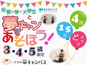 ![]() 東京都市大学 人間科学部 児童学科の学生による 児童文化研究会「ぽっけ」と 保育を学ぶ学生と一緒に 親子で夢キャンパスを楽しもう! 3~5才の子を対象に、 保育を学ぶ都市大生「ぽっけ」が工作、 絵本の読み聞かせ、ぬりえ、おりがみetc...♪ であそべるイベントを行います。 保育士を目指す大学生たちと、 夢キャンパスで過ごしませんか? ママ友・パパ友同士が交流できるおしゃべりブースもありますので ぜひお誘いあわせのうえ、ご参加ください。 参加方法: お申し込みは夢キャンパスホームページから 定員: 各回20組 対象: 3~5才のお子さんと保護者(事前申し込み制・先着順) 参加費: 無料 ※学生主催のイベントですので、お子様のお預かりは行っておりません。 必ず、保護者同伴でご参加ください。 【主催】東京都市大学 【協力】株式会社ラーニングバリュー せたがやeカレッジ(世田谷区教育委員会/国士舘大学/駒澤大学/ 昭和女子大学/東京都市大学/東京農業大学) |