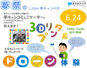![]() 二子玉川ライズ・オフィス8F(リバーフロント) にて夢キャンパスを舞台に活躍する 夢キャンコミュニケーターが 3Dプリンタ&ドローン体験会を行います。 10:00~16:00の間、出入り自由 夢キャンコミュニケーター主催のワークショップは これまで小学生を対象としてきましたが、今回は対象を小学生に限定せず、 大人も!高校生も!それ以外の方も大歓迎です! 3Dプリンタが動いているところを実際に見てみたい! ドローンをとばしてみたい!さわってみたい! 大学生にいろいろ聞いてみたい! と思ったら、ぜひライズ・オフィス8F 二子玉川夢キャンパスへ! 詳細は夢キャンパスホームページをご覧ください。 ◆開催日時: 2017年6月24日(土) 10:00~16:00 ◆開催場所: 東京都市大学 二子玉川夢キャンパス ※参加費無料、お申し込みは不要です。 ※必ず保護者同伴でご参加ください。 学生主催のイベントですので、お子様のお預かりは行っておりません。 ※会場では記録・広報のため写真撮影を行う予定です。 ※当日の入退場は自由です。 |
