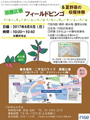 ![]() キーワードに当てはまるものを菜園広場で探してビンゴを作ります。 ■ 開催日時:2017年8月6日(日)10:00~10:40 ■ 集合場所:二子玉川ライズ 菜園広場 (二子玉川ライズ ルーフガーデン3階) ■ 会 場:二子玉川ライズ 菜園広場 ■ 参 加 費:無料 ■定員:15組20名限定 ■対象:5才以上~小学校低学年 ■持ち物:帽子・飲み物・履替えの靴 ※菜園への入園はお子様のみで、保護者の方は菜園外からの見学となります ■お申込み方法 箱根植木㈱担当:北村TEL03-3303-2215 募集期間7月1日~7月31日(土日祝除く) 受付時間9:00~17:00 ※定員になり次第終了とさせて頂きます。 |