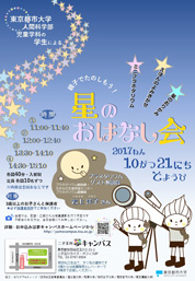 ![]() 東京都市大学 人間科学部 児童学科で保育と幼児教育を学ぶ学生たちによる星や宇宙をテーマにした親子向けイベントを開催します。 当日は、すみだ生涯学習センターの元プラネタリウム館職員・岩上洋子さんをゲストにお招きして、 この日限定のミニプラネタリウムが夢キャンパスに登場! ほかにも都市大生による、星や宇宙にまつわる絵本のよみきかせや、星のおりがみコーナーもご用意して、親子で一緒に楽しめます。 1日4回・各40分(プラネタリウムは約20分予定)完全入替制となっております。 すべての回が同じ内容です。ご希望の時間帯でお申し込みください。 ※先着順・定員制となっておりますので、 おひとりにつき一回のみのお申込みをお願い致します。 複数の時間帯にお申込みされた場合は、 こちらですべての回をキャンセルさせていただきます。 日にち: 10月21日(土) 時間: ①11:00-11:40 ②12:00‐12:40 ③13:30-14:10 ④14:30‐15:10 会場: 東京都市大学 二子玉川夢キャンパス 対象: 幼児(3歳以上)のお子さまと保護者 ※ごきょうだいでお申込みの際は、 お手数ですが人数分のご登録をお願いします。 定員: 各回 親子10名ずつ ※事前予約制・先着順 参加費: 無料 ※会場では記録・広報のため写真撮影を行う予定です。 不都合がある場合は、当日会場にてお申し出ください。 ※学生主催のイベントですので、お子様のお預かりは行っておりません。 必ず保護者同伴でご参加ください。 お申し込み・詳細は夢キャンパスホームページにて 【主催】 東京都市大学 人間科学部児童学科 木内ゼミ 【協力】 せたがやeカレッジ(世田谷区教育委員会/国士舘大学/駒澤大学/昭和女子大学/東京都市大学/東京農業大学) |