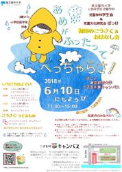 ![]() 東京都市大学人間科学部児童学科学生会&児童文化研究会「ぽっけ」がタッグを組んでプレゼンツ!えほんの読み聞かせと工作を楽しめるイベントを開催します。 これで雨がふってもへっちゃら!夢キャンにあそびにきてね。 ★開催概要 ◆日時:6月10日(日) 11:00~15:00 ◆場所:東京都市大学 二子玉川夢キャンパス ◆参加無料・入退場自由 ◆対象:3歳から小学校低学年 ★一日の予定 10:45 開場 11:00 えほんの読み聞かせ じゆうあそびタイム 13:00 みんなでかさをデザイン! 大きなかさのイラストをすてきな色や絵でかざろう 14:00 えほんの読み聞かせ じゆうあそびタイム 15:00 おわりのごあいさつ *時間内は夢キャンのなかで自由に遊んだり、こうさくをすることができます。 *夢キャン内でお食事をとることはできません。 ★こうさく・つくるもの オリジナルミニかさ・万華鏡・折り紙・ぬりえ かさやかっぱにおえかきもできます! *内容は予告なく変更になる場合があります。 ★保護者のみなさまへ ・お子様のお預かりは行っておりません。 必ず保護者の方が付き添ってください。 ・会場では、記録・広報のため写真撮影を行う予定です。 不都合のある場合は、当日会場にてスタッフまでお申し出ください。 ・本イベントは絵の具などを使用した工作をおこないます。 汚れてもいい服装でご参加ください。 ・当日は、はだしでの活動となります。 保護者の方はスリッパなどの内履きと人数分の靴を入れる袋をご持参ください。 イベント詳細は夢キャンパスホームページにて |