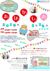 ![]() 東京都市大学 人間科学部児童学科の学生による児童文化研究会「ぽっけ」が夢キャンパスで親子むけ読みきかせ会をおこないます。 ぬりえやおりがみコーナーもあるよ。 ご家族みんなであそびに来てね! 事前お申込み不要・当日の入退場は自由です。 【開催概要】 ◆タイトル:ぽっけのおはなし会 ◆開催期間:2018年5月26日(土) ◆開催時間:11:30~12:00/14:00~14:30(1日2回開催) ◆場 所:東京都市大学 二子玉川夢キャンパス 東京都世田谷区玉川2‐21‐1 二子玉川ライズ・オフィス 8F ◆対 象:未就学児と保護者3~5才のお子さんと保護者 ◆参 加 費:無料 <保護者のみなさまへ> ★お子様のお預かりは行っておりません。必ず保護者の方が付き添いください。 ★会場では、記録・広報のため写真撮影を行う予定です。不都合のある場合は 当日会場にてスタッフまでお申し出ください。 ★当日の混雑状況によっては入場を制限させていただく場合がございます。 【問い合わせ先】 二子玉川夢キャンパス TEL 03-5797-9504 【主催】 東京都市大学 【協力】 せたがやeカレッジ(世田谷区教育委員会/国士舘大学/駒澤大学/昭和女子大学/東京都市大学/東京農業大学) イベント詳細は夢キャンパスホームページにて |