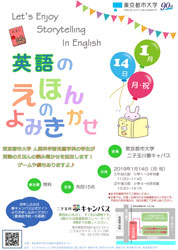 ![]() 東京都市大学 人間科学部児童学科の学生が 英語のえほんの読み聞かせを担当します! ゲームや劇もありますよ! イベント概要 ◆日 時:2019年1月14日(月・祝) ①午前の部(小学1~3年対象) 11:00~11:45 ②午後の部(小学4~6年対象) 13:30~14:15 ◆会 場:東京都市大学 二子玉川夢キャンパス 東京都世田谷区玉川2‐21‐1 二子玉川ライズ・オフィス 8F ◆定 員:各回15名(事前申し込み・先着順) ◆参加費:無料 ◆参加方法:お申し込みは夢キャンパスホームページから ※必ず保護者同伴でご参加ください。 ※会場では、記録・広報のため写真撮影を行う予定です。 不都合のある方は、当日会場にてお申し出ください。 主催 東京都市大学 外国語共通教育センター 協力 せたがやeカレッジ(世田谷区教育委員会、国士舘大学、駒澤大学、昭和女子大学、成城大学、東京都市大学、東京農業大学) 問い合わせ先 二子玉川夢キャンパス TEL 03-5797-9504 |