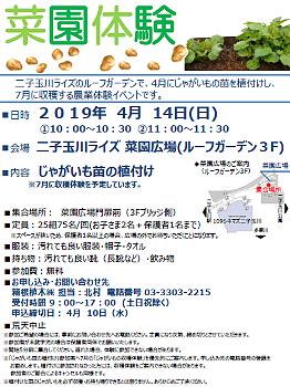 ![]() 毎年恒例の農業体験イベントです。 じゃがいも苗の植付けを行います。 お子さまと一緒に是非ご参加ください。 ◆日時 2018年4月14日(日) ①10:00~10:30 ②11:00~11:30 ◆会場 二子玉川ライズ 菜園広場(ルーフガーデン3F) ◆内容 じゃがいも苗の植付け ◆集合場所 菜園広場門扉前(3Fブリッジ側) ◆定員 25組75名/回(お子さま2名+保護者1名まで) ※スペースが狭いため、保護者1名以上の場合、広場の外でお待ちいただくことになります。 ◆服装 汚れても良い服装・帽子・タオル ◆持ち物 汚れても良い靴(長靴など)・飲み物 ◆参加費 無料 ◆お申込み・お問い合わせ先 箱根植木㈱ 担当:北村 電話番号03-3303-2215 受付時間 9:00~17:00(土日祝除く) 申込締切日 4月10日(水) ◆荒天中止 ◆その他注意事項 ※参加ご希望の場合には、事前にお問い合わせ先へお電話ください。 ※定員になり次第、締切とさせていただきます。 ※参加者が未就学児の場合には保護者同伴でお願い致します。 ※開始5分前に集合してください。遅れた場合、体験に参加できない場合があります。 ※「じゃがいも苗の植付け」参加者へ7月の「じゃがいも収穫体験」を優先的にご案内します。申込先の電話番号登録をお勧めします。植付けに参加されなかった方には、収穫体験をご案内できない場合があります。参加者のご都合によるキャンセルも同様です。 ※植付けした苗のじゃがいもを必ず収穫・お持ち帰りできるとは限りません。あらかじめご了承ください。 |