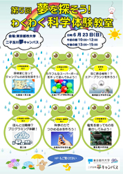 ![]() みなさんは科学が好きですか?「科学」と聞くと理科や勉強のことを考えてニガテだと思う人もいるはず。。。だけど、みんなで楽しく実験すればニガテな気持ちも消えちゃうかも!?大学生たちと科学の力を使って楽しく実験しちゃおう! この「科学体験教室」では、大学生たちが普段学んでいることをみなさんに楽しく教えます!自由研究の題材が見つかるかも!?ぜひ参加してね! 開催概要 ◆開催期間:2019年6月23日(日) ◆開催時間:午前の部10:00~12:00/午後の部13:00~15:00 ◆場 所:東京都市大学 二子玉川夢キャンパス 東京都世田谷区玉川2‐21‐1 二子玉川ライズ・オフィス 8F ◆対 象:小学生(必ず保護者同伴でご参加ください) ◆参 加 費:無料(事前申込制) プログラム ・探検家になってジャングルのお宝を探そう!【小学校低学年向け】 (化源会×医工会学生会) ・カラフルなスーパーボールを作って遊んでみよう!【小学校中学年向け】 (社会メディア学科学生会) ・宙に飾る植物!? エアープランツを作ろう!【全学年向け】 (環境創生学科学生会) ・ほんとは簡単? プログラミング体験!【小学校低・中学年向け】 (通工会) ・科学の力でつかめる水を作ろう!【小学校中・高学年向け】 (自然科学科学生会) ・電気を使ってものを動かしてみよう!【小学校高学年向け】 (電気電子研究会) ※会場では記録・広報のために写真撮影を行う予定です。 不都合のある場合は、当日会場にてスタッフまでお申し出ください。 ※学生主催のためお子様のお預かりはできません。 必ず保護者同伴でご参加ください。 主催 東京都市大学 学科研究会連合 協力 せたがやeカレッジ(世田谷区教育委員会、国士舘大学、駒澤大学、昭和女子大学、成城大学、東京都市大学、東京農業大学) イベント詳細は夢キャンパスホームページにて |