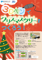 ![]() みんなは「3Dペン」って知ってる?キミの頭で考えるままの形を実現できる「魔法のペン」で、クリスマスツリーを作ったりして遊んでみよう! (3Dペン(ペン先から溶けたプラスチックが出るペン)とテンプレートを使って、小さなクリスマスツリーなどをつくります。3Dペンはペン先から溶解したプラスチックを射出し、直感的に立体物を作ることができるツールです。創造力を豊かにすることが期待できます。) 開催概要 ◆開催期間:2019年12月21日(土) ◆開催時間:15:30~17:30(最終受付17:00) ◆場 所:東京都市大学 二子玉川夢キャンパス 東京都世田谷区玉川2‐21‐1 二子玉川ライズ・オフィス 8F ◆対 象:小学生以上 (小学3年生以下は保護者の同伴が必要です) ◆費 用:無料 ◆参加方法:ご予約不要 当日直接会場へお越しください ◆定 員:50名前後 ◆主 催:東京都市大学 夢キャンコミュニケーター ◆お問合せ:東京都市大学 二子玉川夢キャンパス 電話:03-5797-9504 ※お一人様当たり30分程度を予定しております。 ※予約の必要はありません。当日直接会場へお越しください。 ※参加希望の方が多い場合は、順番待ちとなる場合がございます。 ご理解のほどよろしくお願いいたします。 ※会場では、記録・広報のため写真撮影を行う予定です。 不都合のある方は、当日会場でお申し出ください。 イベント詳細は夢キャンパスホームページにて |
