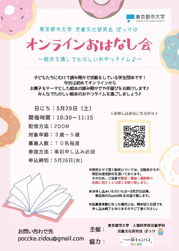 今回は初となるオンラインおはなし会。 みんなでたのしい絵本のおやつタイムを過ごしませんか? 開催概要 ◆開催期間:2021年5月29日(土) ◆開催時間:10:30~11:15 ◆配信方法:Zoomオンライン ◆対象年齢:3歳~5歳程度 ◆募集人数:10名程度 ◆参加費:無料 ◆参加方法:事前申込みが必要です。 夢キャンパスホームページよりお申込みください。 https://yumecampus.tcu.ac.jp/event/8585 ◆申込締切:5月26日(水) ※お申込みいただいた方には5月27日以降、参加用のZoom URLをお送りします。 ◆お問合せ:東京都市大学 児童文化研究会 ぽっけ(poccke.zidou@gmail.com) ★注意★ ※使用する絵本につきましては出版社から特別に使用許可をいただいております。 そのため、ご自身で録音・録画・撮影等の記録に残すことは固くお断りいたします。 ※本イベントはオンライン型イベントになります。 夢キャンパスでは開催しておりませんのでご注意ください。 イベント詳細は夢キャンパスホームページにて |
