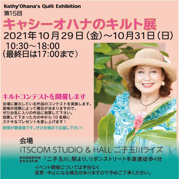 ![]() キャシー中島のキルトスクールに通う生徒さんたちがこの日のために作り上げたフレンドシップキルトや、日ごろのレッスンで作った個人の作品などを中心にいろいろなキルト作品をご覧になって頂ける楽しいキルト展です!もちろん、キャシー中島のキルト作品も併せて展示いたします。 また、新作キルトキットをキャシー中島キルトスクールの公認講師がレッスンするワンデーレッスンが行われます(事前のお申し込みが必要です)。 ※諸事情により日程が変更となりました。ご了承のほどお願いいたします。 【主なコンテンツ】 ・キルト作品展示 ・キルトコンテスト ・ワンデーレッスン ・各種商品販売 【主催】株式会社スタジオ・ケイグループ |