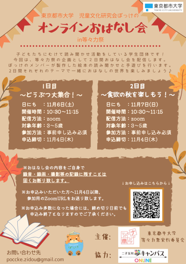 ![]() 東京都市大学 人間科学部児童学科 児童文化研究会 “ぽっけ” によるオンラインおはなし会を開催します。“ぽっけ” は子どもたちに向けて読み聞かせ活動をしている本学の学生団体で、世田谷区内の図書館などでおはなし会を開いてきました。 オンライン3回目となる今回は、本学学園祭「第13回等々力祭」の企画として2日間おはなし会を配信します。ぽっけのメンバーが制作した手作り絵本を初お披露目♪ 6日(土)は「どうぶつ大集合」、7日(日)は「食欲の秋を楽しもう!」をテーマに読み聞かせと手遊びを行います。両日の参加も大歓迎です! どうぞお楽しみください。 開催概要 ◆開催期間:11月6日(土)10:30 ~ 11:15 11月7日(日)10:30 ~ 11:15 ◆開催時間:10:30 〜 11:15 ◆配信方法:Zoom オンライン ◆対象年齢:3歳~5歳程度 ◆費 用:無料 ◆参加方法:事前申込みが必要です。 夢キャンパスホームページよりお申込みください。 ◆お問合せ:東京都市大学 児童文化研究会 ぽっけ Mail: poccke.zidou@gmail.com 主催 東京都市大学 等々力祭実行委員会 注意 ※ご自身で録音・録画・撮影等の記録に残すことは固くお断りいたします。 ※本イベントはオンライン型イベントになります。夢キャンパスでは開催しておりませんのでご注意ください。 イベント詳細は夢キャンパスホームページにて |