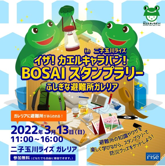 ![]() イザ!カエルキャラバンは、楽しみながら学べる「防災体験プログラム」と「スタンプラリー」を組み合わせた防災訓練イベントです。 10回目の開催となる今年は、二子玉川駅前の広場「ガレリア」を避難所に見立て、「避難・備え」をテーマにしたプログラムを予定しております。 「避難所に行く前に何が必要・・?」「自宅から一番近い避難所は?」 など自分や家族の身を守る大切な知識を親子で楽しみながら学びませんか? 【プログラム紹介(一部)】 ・ダンボールでスツールづくり ・ぽんちょづくり ・防災博士の避難行動クイズ ・避難所でのお片付け ■日程:2022年3月13日(日)11:00~16:00 ■会場:二子玉川ライズ ガレリア ■費用:無料 ■新型コロナウイルス対策について 本イベントでは以下の対策をしております。 ご協力の程よろしくお願いいたします。 ・会場内の人数制限(人数制限の関係で待ち時間が発生する可能性があります) ・受付での検温・消毒 ・スタッフの健康管理、マスクの着用 ・備品の定期的な消毒 |
