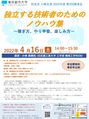 ![]() 東京都市大学 校友会 川崎支部の主催する定例講演会です。 社会で活躍する本学の卒業生を講師に招き、それぞれの専門分野をテーマに講演を行っています。 今回は講師に旧武蔵工業大学工学部機械工学科OB小林政徳氏をお招きし、「独立する技術者のためのノウハウ集~稼ぎ方、やり甲斐、楽しみ方~」という内容で講演いただきます。 開催概要 ◆開催期間:2022年4月16日(土) ◆開催時間:14:00~15:30(受付開始13:30~) ◆場 所:東京都市大学 二子玉川夢キャンパス 東京都世田谷区玉川2‐21‐1 二子玉川ライズ・オフィス 8F ◆対 象:20歳~70歳 ◆参 加 費:無料(お茶、水をご用意いたします。) ◆参加方法:東京都市大学 校友会 川崎支部 山岸まで電話またはメールにてお申し込み(事前申込制) ※要お名前、ご連絡先 ※会場は定員20名、ZOOMでも開催いたします。 講演内容 従来の日本型「終身雇用」の制度はなくなり,「ジョブ型雇用」に変わりました。 雇用も「就社」から「就職」に変わります。そこで,技術者が「終身雇用」の制度から離れ、「独立する技術者」を目指す人が近年増えてきました。企業に所属していれば,「技術者」は、「優秀な歯車」として業務の一部を担当するだけで良かったのですが,「独立する技術者」となると,「全てを一人でこなす能力」が求められます。しかし,「全てを一人でこなす能力」を教える講演会,セミナー,学校,予備校,塾などは殆ど存在しません。 そこで,今回は「技術士」という視点から「独立する技術者のためのノウハウ集」という内容についての成功例を示すと共に, 稼ぎ方・やり甲斐・楽しみ方についてご紹介させて頂きます。 更に詳しい内容をお知りになりたい方には「独立起業塾」の内容についてもお知らせします。 ※会場では、記録・広報のため写真撮影を行う予定です。不都合のある方は、当日会場にてお申し出ください。 ※新型コロナウイルスの蔓延状況によっては直前の延期・中止もありえますこと、ご了承ください。 主催 東京都市大学 校友会 川崎支部 協力 せたがやeカレッジ(世田谷区教育委員会, 国士館大学, 駒澤大学, 昭和女子大学, 成城大学, 東京都市大学, 東京農業大学) お申込み・お問合せ先 東京都市大学 校友会 川崎支部 山岸 TEL: 080-9353-4253 MAIL: k_yamagishi@hexel.co.jp イベント詳細は夢キャンパスホームページにて |