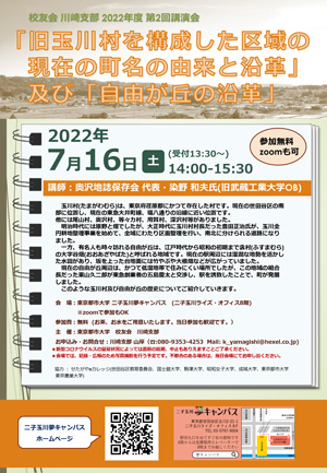現在の世田谷区の南部に位置し、現在の東急大井町線、環八通りの沿線に近い位置です。 他には尾山村、奥沢村、等々力村、用賀村、深沢村等がありました。 明治時代には原野と畑でしたが、大正時代に玉川村村長だった豊田正治氏が、玉川全円耕地整理事業を始めて、全域にわたり区画整理を行い、南北に分けられる道路になりました。 一方、有名人も時々訪れる自由が丘は、江戸時代から昭和の初期まで衾村(ふすまむら)の大字谷畑(おおあざやばた)と呼ばれる地域でした。 現在の駅周辺には湿潤な地勢を活かした水田があり、坂を上った台地面には竹やぶや大根畑などが広がっていました。 現在の自由が丘駅の周辺は、かつては低湿地帯で住みにくい場所でしたが、この地域の組合長だった栗山久二郎が東急創業者の五島慶太と交渉し、駅を誘致したことで、町が発展しました。 このような玉川村及び自由が丘の歴史についてご紹介していきます。 【開催概要】 ◆日 時:7月16日(土) 14時~15時30分(受付 13時30分~) ◆講 師:奥沢地誌保存会 代表 染野 和夫氏(旧武蔵工業大学OB) ◆会 場:東京都市大学 夢キャンパス(二子玉川ライズ・オフィス8階) ※zoomで参加OK ◆参 加 費:無料(お茶、お水をご用意いたします。当日参加も歓迎です。) ◆主 催:東京都市大学 校友会 川崎支部 ◆お申込み・お問い合わせ: 川崎支部 山岸 ☏:080-9353-4253 Mail: k_yamagishi@hexel.co.jp ◆協 力:せたがやeカレッジ(世田谷区教育委員会、国士館大学、駒澤大学、 昭和女子大学、成城大学、東京都市大学、東京農業大学) ◆注 意:新型コロナウイルスの蔓延状況によっては直前の延期、中止もありえますことご了承下さい。会場では記録・広報のため写真撮影を行う予定です。不都合のある場合は、当日会場にてお申し出ください。 イベント詳細は夢キャンパスホームページにて |