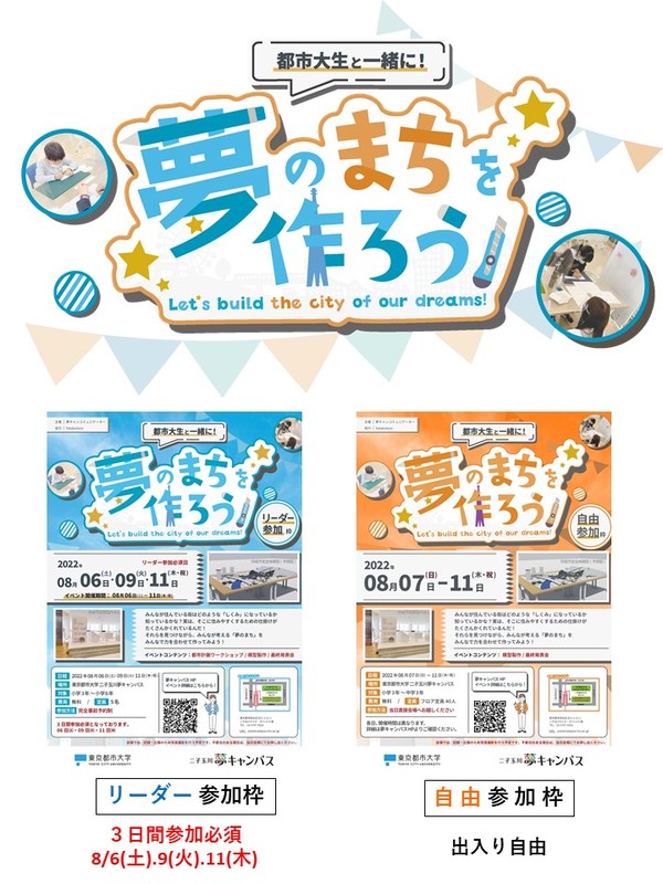 みんなが住んでいる街はどのような「しくみ」になっているか知っているかな?実は、そこに住みやすくするための仕掛けがたくさんかくれているんだ!それらを見つけながらみんなが考える「夢のまち」を力を合わせてつくってみよう! 開催概要 ◆製作期間:8月6日(土)~8月11日(木・祝) ◆会 場:東京都市大学 二子玉川夢キャンパス ◆参 加 費:無料 ◆参加方法:今回は2つの参加方法でメンバーを募集します! ★リーダー参加:まちづくりを計画するところから参加 ★自由参加:まちに設置する建物の模型づくりで参加 ※下記の参加条件をチェックして参加方法をお選びください。 ★リーダー参加★ まちづくりを計画するところから一緒に考えるメンバーを募集します! 【参加対象】小学3年生~小学6年生 【定員】5名 【内容】まちづくりのためのワークショップ/模型製作 【参加条件】下記の日程すべてに参加可能な方 ・8月6日(土)10:00~15:30 まち計画ワークショップ① ・8月9日(火)13:00~16:00 まち計画ワークショップ② ・8月11日(木・祝)12:00~13:00 最終発表会 ※申込締切:8月5日 (金) 17時 ※10日まではいつでも模型づくりに参加できます。 【参加方法】完全事前予約制 リーダー参加の詳細はこちらをご覧ください。 ★自由参加★ まちに設置する建物の模型づくりで参加したい方はこちら! 【参加対象】小学3年生 ~ 中学3年生 【定員】フロア定員40名 【内容】模型製作 【参加日程】8月7日 ( 日 ) ~8月11日 ( 木・祝 ) 【参加方法】期間中自由に来場いただき模型づくりに参加できます。 自由参加の詳細はこちらをご覧ください。 【お申込み方法】 各参加方法の詳細ページより内容をご確認のうえ、お申込みください。 【主催】 夢キャンコミュニケーター 【協力】 futacoloco イベント詳細は夢キャンパスホームページにて |