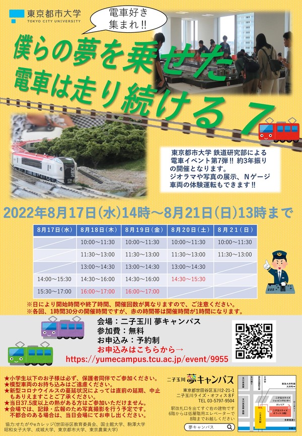 2019年8月以来中止になっていました夏休み恒例のイベント「僕らの夢を乗せた電車は走り続ける」の開催が決定しました! 東京都市大学 鉄道研究部によるジオラマ・Nゲージ運転体験・写真展示と人気のイベントをご用意しております。ぜひお越しください! 開催概要 ◆参 加 費:8月17日(水)~8月21日(日) ◆開催時間:日により開始時間や終了時間が 異なります。 詳細はこちらをご確認下さい。 ◆場 所:東京都市大学 二子玉川夢キャンパス ◆対 象:どなたでもご参加できます。 ◆定 員:各回40名 ◆参 加 費:無料 ※申込時間内では、途中参加/退出が出来ます。 ◆参加方法:お申込みは夢キャンパスホームページから 主催 東京都市大学 鉄道研究部 お問い合わせ 東京都市大学 二子玉川夢キャンパス(TEL03-5797-9504) 注意事項 ★小学生以下のお子様は、必ず保護者同伴でご参加ください。 ★模型車両のお持ち込みはご遠慮ください。 ★新型コロナウイルスの蔓延状況によっては直前の延期、中止もありえますことご了承ください。 ★当日37.5度以上の熱がある方はご参加いただけません。 ★会場では、記録・広報のため写真撮影を行う予定です。不都合のある場合は、当日会場にてお申し出ください。 イベント詳細は夢キャンパスホームページにて |