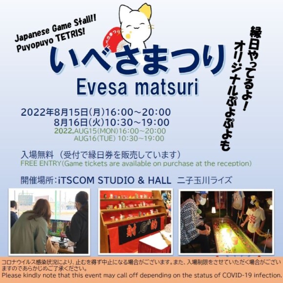 ![]() 楽しい夏がやってきました!ご家族みんなで楽しめる縁日とeスポーツ「オリジナルぷよぷよ」を体験できるイベントです。水ヨーヨーやスーパーボールすくいなどをご用意しています。入場は無料です。会場で縁日券をお買い求めください。 ◇eスポーツ「オリジナルぷよぷよ」参加は無料 ◇縁日コーナー ◇ゲームコーナー ◇工作コーナー ※縁日券:5枚つづり¥1,000/12枚つづり¥2,000 ※縁日券の販売・ご入場はイベント終了時間の30分前までとなっています。 ご来場お待ちしています! |