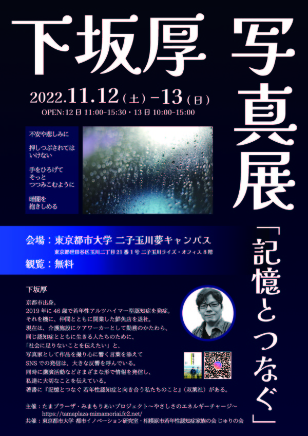 認知症の有無に関わらず、『認知症とともに生きる』ためのイノベーションを生み出そうと手を組み、『認知症になってもその人らしく、暮らし続けられる』環境である地域をつくるため、その方の持っている能力を発揮して活動する姿を伝えています。 また、当事者の社会参加の促進や意欲喚起、『認知症になると何も分からなくなる』といった偏見を払拭し、社会参加への理解を促進するため、この度、若年性認知症当事者で写真家としても活動されている下坂厚氏のご協力のもと、下坂厚 写真展 「記憶とつなぐ」 を開催いたします。 是非、会場にお運びいただいて、写真から伝わるメッセージを受け取って下さい。 開催概要 ◆開催期間:2022年11月12日(土)13日(日) ◆開催場所:東京都市大学 二子玉川夢キャンパス ◆参加対象:どなたでもご参加ください ◆参 加 費:無料 主催 たまプラーザ・みまもりあいプロジェクト~やさしさのエネルギーチャージ~ 共催 東京都市大学 都市生活学部都市イノベーション研究室・相模原市若年性認知症家族の会「じゅりの会」 イベント詳細は夢キャンパスホームページにて |
