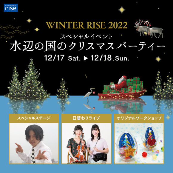 ![]() 二日間限定で開かれる、水辺の国のクリスマスパーティー。 すてきな生演奏やダンスショーを楽しんだり、ワークショップに参加したり。 子どもも大人も楽しめること盛りだくさん! ■クリスマススペシャルステージ クリスマスツリー特別演出の楽曲を手掛ける作曲家・永友聖也氏が 今回のために作った特別曲やクリスマス定番ソングを初披露。 楽器の生演奏とあわせてFly Six Bによるダンスパフォーマンスを行います。 〈出演者〉 永友聖也 / Fly Six B ※メンバー2 名が登場! ■日替わりライブ 日替わりでアーティストの生演奏が聴けるライブを開催♪ 〈出演者〉 12月17日(土) 北欧アイルランド音楽:tipsipúca(duo) 12月18日(日) 弦楽カルテット:Digging Deeply Quartet ■オリジナルワークショップ 自由にパーツを選んで飾り付けができる、 オリジナルフラッグやマラカス作りのワークショップを開催します。 フラッグやマラカスで音楽祭をさらに盛り上げよう! ※詳細は後日WINTER RISE 2022特設ページにて更新予定です。 |