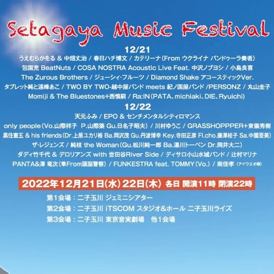 ![]() この度、文化庁はAFF2「ARTS for the future!」と称した、コロナ禍からの文化芸術活動の再興支援事業において「世田谷Music Festival」の開催事業を行うこととなりました。 コロナ禍も、世界の平和も現在転換期に入り、安定と収束が強く望まれておりますが、影響力のあるアーティスト達が集うイベントの開催を通じ世田谷から観客に対し人と人の強い絆を発信する世田谷 Music Festivalが開催されます。 タイムスケジュール ※iTSCOM STUDIO & HALL分のみ 【12/21】 12:00~ カテリーナ 14:00~ Momiji & The Bluestones+西慎嗣 16:00~ PERSONZ 18:00~ Diamond Shake アコースティックVer 20:00~ COSA NOSTRA Acoustic Live Feat. 中沢ノブヨシ 【12/22】 11:20~ ザ・レジェンズ 13:00~ 黒住憲五&His Friends 15:00~ ダディ竹千代とデロリアンズ with世田谷River Side 17:10~ EPO&センチメンタルシティロマンス 19:00~ 南佳孝 *会場受付で 当日券の販売をいたします 主催:世田谷 Music Festival 実行委員会 |