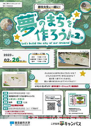 みんなはどんなまちに住んでみたいかな? どうしたら住みやすいまちになるかな。 夢キャンコミュニケーターが、futacoloco協力のもと、子どもたちと一緒に話し合い、協力し合いながら子どもたちの考えだけで夢のまちをつくっていきます! 昨年8月に行われた第1弾では、二子玉川の地形に見立てたまっさらな土地に、小中学生が理想のまちづくりを計画しました。そこへスチレンボードを使って製作した学校やお店などの建物を設置したり、芝生を敷いて公園にしたり、子どもたちの理想が詰まった夢のまちをつくりました。 第2弾では更に建物や緑を増やし、パワーアップしたまちづくりを目指します。 開催概要 ■開 催 日:2023年2月26日(日) ■開催時間:10:00~17:00 ■対 象:小学3年~中学3年生 ■定 員:12名 ■会 場:東京都市大学 二子玉川夢キャンパス ■参 加 費:無料 ■申込方法:「夢キャンパスホームページ」よりお申込みください。 ■申込締切:2023年2月25日(金)17:00 主催 夢キャンコミュニケーター 協力 futacoloco 注意事項 ・模型製作にはカッターナイフを使用します。 受付時に保護者が「カッターナイフ使用に関する同意書」をご確認いただき、 同意のうえご参加ください。 ・16:20までは保護者見学を不可とさせていただきます。 ・感染症拡大防止のため、検温と消毒を実施しております。 当日37.5℃以上の熱がある方はご参加いただけませんので、 予めご了承ください。 また、イベント参加時は、健康上の理由などのやむを得ない場合を除き、 マスクの着用にご協力をお願いいたします。 ・会場では記録・広報のために写真撮影を行う予定です。 不都合のある方は、当日会場にてお申し出ください。 イベント詳細は夢キャンパスホームページにて |