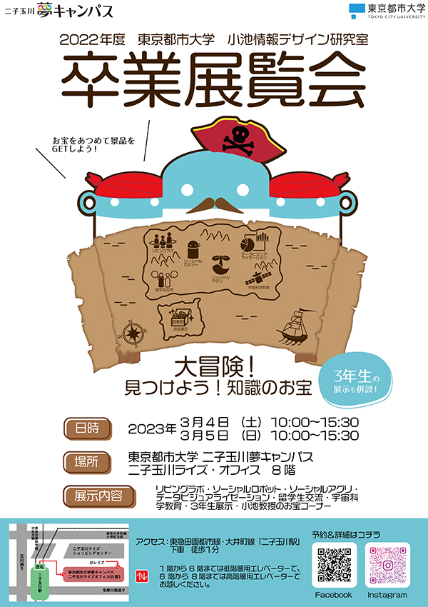 小池研究室は、社会問題の解決の手段としてデザインのあり方を研究しており、 ユーザ視点に立ってジャンルにこだわらず情報デザインに取り組んでいます。 この展覧会は毎年1回、本学横浜キャンパスの小池研究室が単独で主催している展覧会で、 小池研究室に所属する学生がこの1年間、卒業研究やゼミを通して作り上げてきた成果物の数々を一挙大公開致します! 純粋にデザインに興味がある方、また近隣の皆様 、まだ研究室選びで迷っている社会メディア学科2年生の方、小池研についてもっと知りたい方はぜひ足をお運びください。 開催概要 ■開 催 日:2023年3月4日(土)、5日(日) ■開催時間:10:00~15:30 ■定 員:1枠先着10名様 ■会 場:東京都市大学 二子玉川夢キャンパス ■参 加 費:無料 ■申込方法:「夢キャンパスホームページ」よりお申込みください。 展示内容 1)4年生 ・リビングラボのデザイン 近隣小学校での不登校児のサポート実践とフィールドワーク ・宇宙科学教育のデザイン 人工衛星の電波受信ワークショップのフィールドワークと 参加者による共同的理解の考察 ・データビジュアライゼーションのデザイン コロナ問題や地球温暖化問題の肯定派, 否定派のそれぞれの情報の可視化方法の調査 ・ソーシャルロボットのデザイン 既存ソーシャルロボットの調査と展望 ・留学生のコミュニケーションのデザイン 留学生と日本人学生とのワークショップのフィールドワーク ・水耕栽培のコミュニティのデザイン 小学校,不登校児をサポートするNPO, 精神障がい者をサポートするNPOと水耕栽培の ワークショップを行い,SNSのコミュニティを作り, そのコミュニティの変容をフィールドワーク (2)3年生 ・IoTデザイン 日常生活をサポートするデバイスのプロトタイプを Raspberry PiとNode-REDを使用してデザイン ・精神障がい者のサポートアプリのデザイン 精神障がい者のヒアリングからアプリのインタフェースをデザイン ・ロケットのラッピングデザイン 東京都市大学で開発中の小型ロケットのラッピングデザインの プロトタイピングに挑戦しました. ・インフォグラフィックスのデザイン (3)小池先生のお宝展 いるのか,いらないのかよくわからない物のコレクション 主催 東京都市大学 メディア情報学部社会メディア学科 小池研究室 ※会場では、記録・広報のため写真撮影を行う予定です。 不都合のある場合は、当日会場にてお申し出ください。 イベント詳細は夢キャンパスホームページにて |