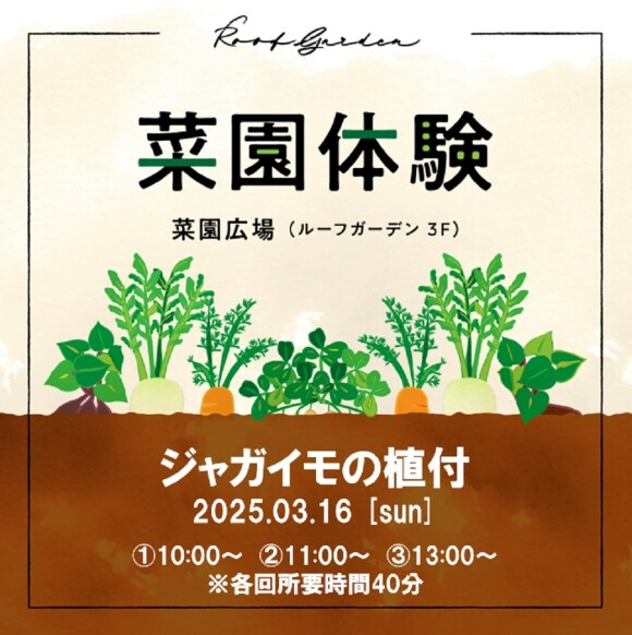 ![]() 二子玉川ライズ・テラスマーケットの屋上には『ルーフガーデン』と呼ばれる屋上庭園があります。 その中の1つである「菜園広場」では、一年を通して、子どもたちに“野菜を育てる楽しみ、収穫して食べる楽しみ”を感じていただける菜園体験イベントを開催しております。 今年最初の菜園体験は、ジャガイモの植付を行います。 本イベントに参加いただいた方には、6月実施予定の収穫イベントにも優先してご参加いただけます。 ◆参加費:無料 ◆お申込み:Passmarketにて受付 ◆申込期間:2/23(日)10:00~3/1(土)17:00まで ◆当落発表:3/4(火)予定 ◆チケット購入締切:3/13(木)まで ※当選者のみ 【備考】 持ち物:汚れても良い服装や靴・タオルなど 【リンク】 お申込みサイト https://passmarket.yahoo.co.jp/event/show/detail/02ius7us7k841.html |