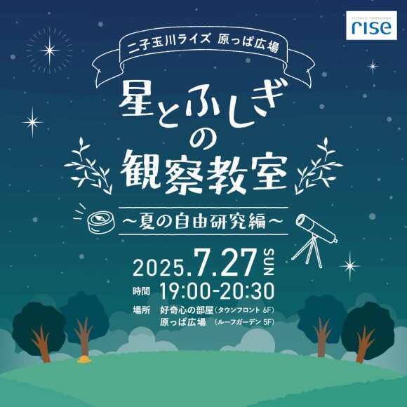 ![]() 二子玉川ライズからどんな天体が見えるでしょう。 店舗にて事前学習をした後、専門スタッフと一緒に望遠鏡を使って天体観測をします。今回は火星、月、夏の星座を観察予定です。初めての方でも、気軽にご参加いただけるイベントとなっており、夏の自由研究のテーマとしてもおすすめです。 【日時】 2025年7月27日(日) ①19:00~ ②19:30~ ③20:00~ ※各回30分(事前学習10分、観測時間20分) ※空き状況は店舗までお問い合わせください。 【場所】 好奇心の部屋(タウンフロント 6F) 原っぱ広場(ルーフガーデン 5F) 【人数】 各回5組10名様 【参加費】 500円(税込) 【参加方法】 店頭またはお電話(03-6805-6577)でのご予約。※先着順。 |