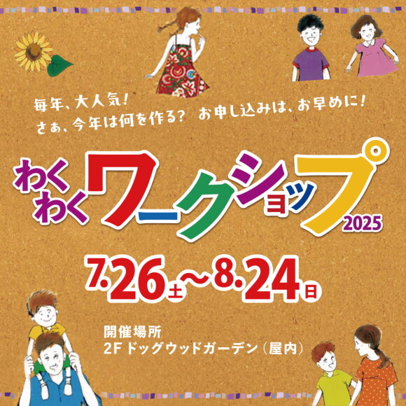 ![]() 【毎年大人気!わくわくワークショップ】 小さなお子様でも簡単に楽しめるワークショップ!インテリアにぴったりなジェルキャンドルや、シーグラスを使ってかわいらしい小物を作ったり。ペットボトルキャップアートで楽しくエコを学んだり、親子で参加できるパン教室も楽しめるよ!他にも楽しいワークショップがたくさんあります! 【詳細はこちら】わくわくワークショップ特集ページ https://www.dogwood-plaza.com/campaign/2025workshop.html |