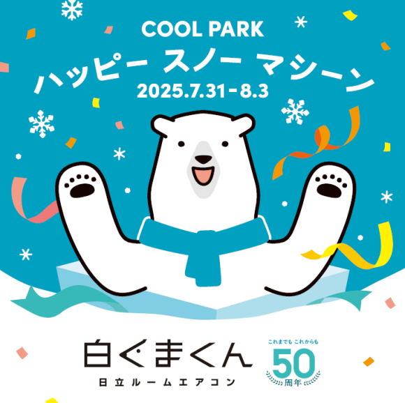 ![]() 白くまくん COOL PARK ハッピー スノー マシーン 昨年も大好評だったイベント「白くまくん COOL PARK」! 今年は、白くまくん誕生50周年をお祝いする内容にパワーアップ! 紙吹雪のように吹きだす“真夏の雪” を 白くまくんといっしょに楽しめる 「ハッピー スノー マシーン」をはじめ、 スーパーボールすくい、わなげ、的あて、 かざぐるま工作体験、涼しい白くまくんドームなど、 大人から子どもまで楽しめるコンテンツが盛りだくさん! つめた~いフローズンドリンクもご用意しておりますので、 ぜひ遊びにきてください! ※一部内容を変更する場合がございます ・紙吹雪のように吹きだす“真夏の雪” を 白くまくんといっしょに楽しめる 「ハッピー スノー マシーン」 ・スーパーボールすくい ・わなげ ・的あて ・かざぐるま工作体験 ・涼しい白くまくんドーム 主催:ジョンソンコントロールズ日立空調 詳細はこちら https://kadenfan.hitachi.co.jp/ra/coolpark/ 白くまくん 公式Instagram https://www.instagram.com/shirokumakun_h/ 白くまくん 公式X https://x.com/shirokumakun_h |