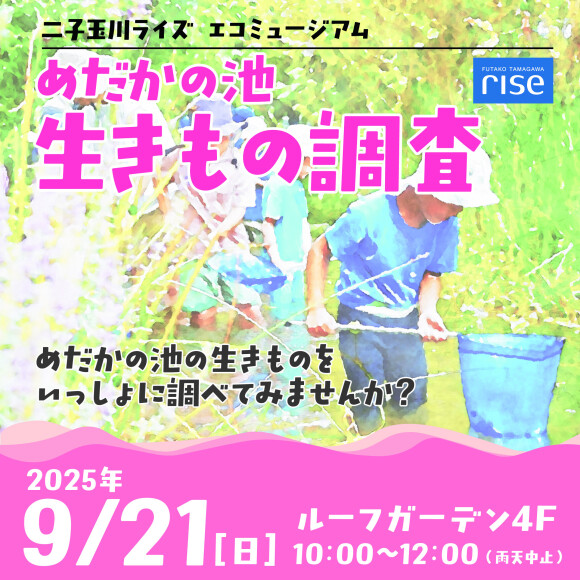 ![]() めだかの池の生きものを一緒に調べよう! 二子玉川ライズ テラスマーケットの屋上には『ルーフガーデン』と呼ばれるエコミュージアムがあります。4Fにある「めだかの池」では、毎年、年に一度特別に池に入り、どんな生きものがいるか調査するイベントを開催しています。 いつもは陸からしか見られない生きものを近くで観察してみませんか? (採った生きものは観察後に池に戻します) 【お申込み方法】 イベント申込サイト『Pass market』での抽選申込制 抽選申込期間 :8月21日(木)10:00~9月4日(木)17:00 抽選結果発表 :9月8日(月)予定 チケット購入締切:9月17日(水)※当選者のみ 【備考】 ◆参加費:無料 ◆定員:15組(要予約・抽選) ◆持ち物:タオル、帽子、飲み物、ウォーターシューズ(水遊び用のかかとが固定されるもの) ※汚れてもよい服でお越しください。着替えもあると安心です。 【リンク】 お申込みはコチラ(8/21~申込受付開始) https://passmarket.yahoo.co.jp/event/show/detail/029sw26wd9j41.html |