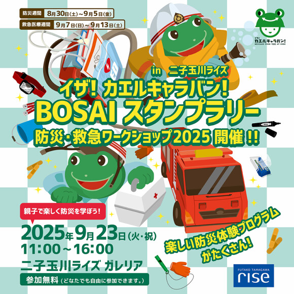 ![]() イザ!カエルキャラバン!BOSAI スタンプラリー は、楽しみながら学べる「防災体験プログラム」と「スタンプラリー」を組み合わせた防災訓練イベントです。二子玉川ライズでは、今年で13回目の開催となります。 災害の危険に備えて、親子で防災・救急のワザや知恵を楽しく学びながら、スタンプラリーで防災関連グッズをゲット!地震発生前のいつもの備えや、発生時に避難所などで使用する備蓄品について理解を深めませんか? 【防災体験プログラムの一例】 ・お家の防災グッズなぁに?クイズ ・毛布で担架タイムトライアル ・応急手当ワークショップ ・紙食器づくり ■日程:2025年9月23日(火・祝)11:00~16:00(※受付は15:30まで) ■会場:二子玉川ライズ ガレリア ■費用:無料 |
