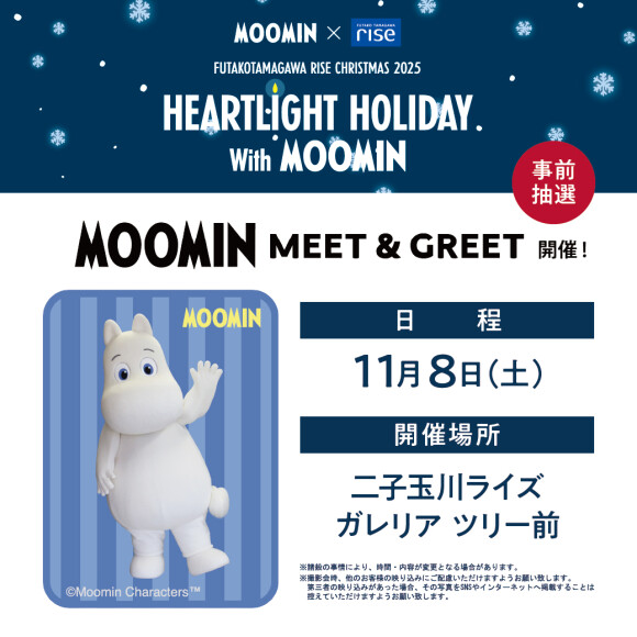 ![]() 今年の二子玉川ライズのクリスマスは、今年80周年を迎えた「ムーミン」と「HEARTLIGHT HOLIDAY With MOOMIN」をテーマに、コラボレーションします。 クリスマスイベントの開催を記念し、ムーミンのスペシャルグリーティングを実施します! ■実施日:2025年11月8日(土) ■実施時間:①11:00~ ② 11:15~ ③13:00~ ④13:15~ ⑤15:00~ ⑥15:15~ ※集合時間は、各開催時間の10分前となります。 ■実施場所:二子玉川ライズ ガレリア ツリー前 ※二子玉川ライズ S.C. タウンフロント 6F ムーミンショップとは別の会場となります。 ■参加費:無料 ■参加方法:事前予約 ※各回の参加可能組数には限りがあるため、応募者多数の場合は、抽選となります。 ■受付期間:10月24日(金)~31日(金)23:59 ※1グループ1回までのお申込みとさせていただきます。 ※グリーティングには、1組4名様までご参加いただけます。 ※二子玉川ライズ S.C. タウンフロント 6F ムーミンショップでは、お申し込みを承っておりません。 ■ご当選者の発表 当選結果は、11月4日(火)に、「LivePocket-Ticket-」にご登録頂いたメールアドレス宛にお送りいたします。 また、「LivePocket-Ticket-」マイページでも、当選結果をご確認頂けます。 ※抽選結果に関するお問い合わせには、お答えできませんので、あらかじめご了承ください。 ■スペシャルグリーティング実施時の注意事項 ・集合時間に遅れた場合は、ご参加いただけません。 ・グリーティングのお時間には限りがあります。スタッフのご案内に合わせてご参加をお願いいたします。 ・1組につき、カメラ1台のみの撮影となります。複数台の撮影はできません。 ・1組につき、カメラ1台のご用意をお願いします。撮影は、お客様のカメラをスタッフがお預かりして撮影いたします。 ※スタッフによる撮影のため、ご希望に添えない場合がございます。 ・撮り直しはできません。 ・荒天などにより、イベントが中止になる場合がございます。 ・キャラクターへのプレゼントやお手紙はお受け取りができません。 ▶チケット申し込みはこちら(受付期間:10月24日(金)~31日(金)23:59) https://t.livepocket.jp/e/0xqu5 |